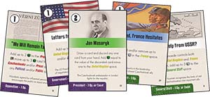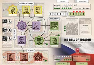 The Bell of Treason: 1938 Munich Crisis in Czechoslovakia Defending our independence and democracy in the middle of Europe, we defend the freedom of the whole of Europe. Thus we fulfill the historical mission of the Czechoslovak state. We Will Remain Faithful - Manifesto signed by 308 influential personalities of Czechoslovakia on May 15th, 1938, and later signed by an additional 1.5 million ordinary Czechoslovak citizens During the crisis period of 1938, Czechoslovakia underwent an internal moral struggle about whether or not to stand and fight against Nazi Germany, the consequences of which Czech and Slovak society have probably never fully come to terms with. The decision to concede the Sudetenland to Germany was a difficult one, and the merits of both sides of the argument are clear: pragmatically, there was little hope that Czechoslovakia could have survived a German invasion in 1938, but its spirit was still strong, and a decision to fight could have sent a clear message to the rest of Europe and altered the course of history. How did Czechoslovakia, with a proud, professional military and seemingly strong alliances with France and the Soviet Union, end up making this fateful decision to concede in 1938? The Bell of Treason allows you to relive the events in Czechoslovakia that led up to this decision and potentially change the course of history. The Bell of Treason is a fast-paced, card-driven board game in which two players experience the existential crisis faced by Czechoslovakia in response to Hitlers territorial demands. One player represents the ideal of trying to Defend the country, even without allies and at any cost. The other player represents the historically victorious ideal of agreeing to Concede the Sudetenland territory, in order to prevent bloodshed and hoping that Hitlers demands would stop there. The game adapts the crisis modeling system originally introduced in Mark Hermans Fort Sumter and then further developed in Fred Servals Red Flag Over Paris. The game does not make any judgment about whether it would have been the right choice for Czechoslovakia to defend itself in 1938, nor whether such a defense could, in any sense, have been successful. Instead, it allows you to experience for yourself this crisis period of 1938, which forever influenced Czechoslovakias path and the eventual course of World War II. The game can also be played solo, using an adaption of the innovative and elegant system originally designed by Jason Carr for Red Flag Over Paris. In 1940, about 14% of the tanks deployed by Hitlers Third Reich in the Western Campaign against France had been designed and produced in Czechoslovakia. The commander of the 7th Division, Erwin Rommel, praised their reliability and resilience, much needed for his rapid advance. Hitler had acquired these tanks and other armaments from Czechoslovakia practically without a fight after the occupation of Bohemia and Moravia on March 15th, 1939. By that time the country was no longer able to protect itself, having lost its easily defended mountain border, advanced fortifications, and most importantly the will to fight. In March of 1939, the morale of the country was already broken, but this was not yet the case in September of 1938. In 1938, Czechoslovakia was the only truly democratic country in Central Europe, and the populations determination to defend their homeland was higher than at any other point in this young republics history. Experienced generals, many of them former legionnaires who had fought in World War I, commanded the professional and relatively well-equipped Czechoslovak army. However, the country did not end up defending itself against Germany, instead ceding its strategic territory in the Sudetenland to the German Reich as dictated by the Western European powers at the Munich Conference on September 29th, 1938. Present at this conference were the British Prime Minister Neville Chamberlain (the leading promoter of German appeasement), the French Prime Minister douard Daladier (whose country had signed a defensive treaty with Czechoslovakia), the Italian dictator and mediator of the meeting Benito Mussolini, and Adolf Hitler, who had long been determined to deal with the Czechoslovaks by military means. Together these four leaders signed the so-called Munich Agreement, culminating a crisis that had started with the Sudeten Germans demand for autonomy based on false claims of Czechoslovak oppression. Most of the population of Czechoslovakia was ready to defy this agreement, even if it meant war with Germany, but the Czechoslovak government decided to concede the Sudetenland in order to avoid bloodshed. This decision was followed shortly by additional territorial concessions to Poland and Hungary and, less than 6 months later, by the independence of Slovakia and the occupation of Bohemia and Moravia by German forces. Appeasement had not been successful, and Czechoslovakia had surrendered practically without a fight. Highlights: In 1938, the Czechoslovak President Edvard Bene wanted to prevent unnecessary bloodshed at all costs; so in order to win, the Defend player must either convince the president to fight or overthrow him in a coup. Either option is achieved by having a number of green Defend cubes in one space in or adjacent to the President space, at least equal to the number of white Concede cubes in the President space. At the same time, the Defend player must also show the legitimacy of their decision to fight by having at least 1 Victory Point. The impact of Britains appeasement policy is modeled through the unusual unidirectional adjacency arrows of International spaces. The UK, France, and the Soviet Union are all able to influence Czechoslovak politics, but the Soviet Union can only be influenced by France, and France in turn can only be influenced by the UK. This demonstrates the political interdependencies of the international powers, as well as the external pressures applied to Czechoslova