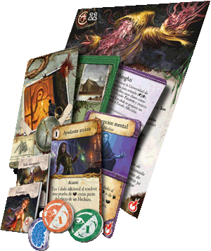 Contenido: 1 reglamento, 4 hojas de Investigador, 1 hoja de Primigenio, 8 cartas de Misterio, 84 cartas de Encuentro, 24 cartas de Mitos, 4 cartas de Preludio, 4 cartas de Artefacto, 16 cartas de Apoyo, 28 cartas de Estado, 12 cartas de Hechizo, 16 cartas de Apoyo nico, 8 fichas de Monstruo, 20 fichas de Discapacidad, 4 fichas de Investigador, 4 soportes de plstico.