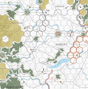 While historically, the situation was dismal for the Third Reich, the objective is for players to do better than their historical counterparts. Each side is divided into two sub-commands. For the Axis, this includes the Nord Armee Kommando and Sud Armee Kommando, for the Soviets, the Third Ukrainian and parts of Second Ukrainian Fronts, as well as a Bulgarian army and a Yugoslav corps. The scenario starts on 6 March 1945 (the opening of Spring Awakening) and carries through to 16 April (following the Soviet capture of Vienna). Each game turn represents one week of operations. Each hex is 18 kilometers across. Most ground units are corps, representing two to five divisions.
