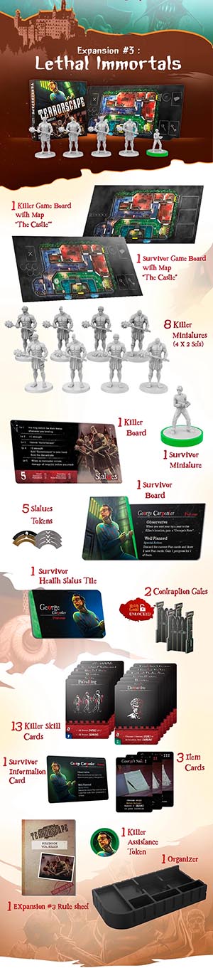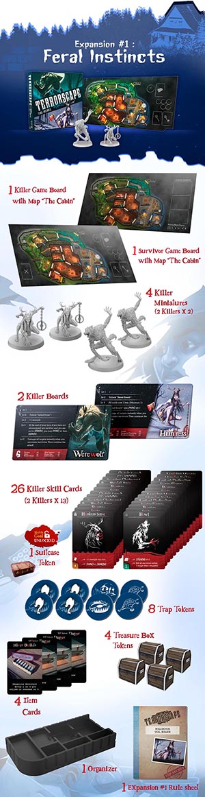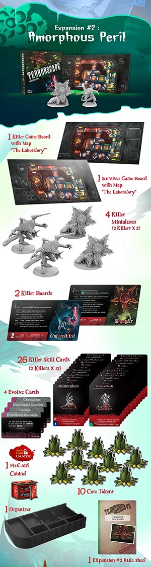 TerrorScape Temporada 1 Triloga de Expansiones Edicin en Espaol Esta Triloga de Expansiones de la Temporada 1 de TerrorScape incluye las expansiones Instintos Salvajes (1), Peligro Amorfo (2) e Inmortales Letales (3). Estas expansiones no se pueden adquirir por separado LAS EXPANSIONES DE LA TEMPORADA 1 SE PUEDEN COMBINAR CON EL JUEGO BASE DE LA TEMPORADA 2 NO ERA CONCEBIBLE TROCEAR ESTE CONTENIDO Sencillamente, cuando algo es tan bueno como las expansiones de TerrorScape, no es posible trocearlo. Es un todo o nada, y as se presenta esta primera triloga, como en las mejores pelculas. Todo el contenido mostrado en ingls ser ntegramente traducido al espaol. Expansin 1: Instintos Salvajes Dos grandes clsicos del cine de terror: La Bruja de los Bosques y el Hombre Lobo.Esta expansin traslada la accin a una cabaa en el bosque, un entorno ms abierto y salvaje que contrasta con la claustrofobia de la mansin. Introduce dos nuevos asesinos: el Hombre Lobo, conocido por su velocidad y ataques feroces que pueden abrumar a los supervivientes si no se coordinan, y la Cazadora, experta en trampas y ataques a distancia que obliga a los jugadores a replantear sus movimientos. Los supervivientes reciben nuevas cartas de objetos, como cebos para despistar al asesino o equipo de supervivencia para resistir en el bosque. El tablero de la cabaa incluye zonas al aire libre, como senderos y claros, que aaden un componente tctico diferente, ya que los supervivientes tienen menos paredes donde esconderse, pero ms espacio para maniobrar. Los jugadores destacan que esta expansin es ideal para quienes buscan un cambio de escenario, aunque algunos comentan que el Hombre Lobo puede ser un desafo para los supervivientes novatos debido a su agresividad. Expansin 2: Peligro Amorfo Cualquier parecido con el Demogorgon o Venom es mera coincidencia...Esta expansin lleva a los jugadores a un laboratorio abandonado, con un diseo industrial lleno de pasillos metlicos y luces parpadeantes. Introduce dos nuevos asesinos: el No Identificado, una criatura mutante que cambia sus habilidades durante la partida segn las cartas jugadas, lo que lo hace impredecible, y el Estrangulador, que utiliza trampas de control, como cables o redes, para inmovilizar a los supervivientes. Los supervivientes reciben equipo tecnolgico, como drones de exploracin para revelar zonas del tablero o inhibidores de seal para desactivar trampas del asesino. El tablero del laboratorio es ms abierto que la mansin, con menos lugares para esconderse, lo que fuerza a los supervivientes a ser ms astutos. Los jugadores alaban la originalidad del No Identificado por su capacidad de adaptacin, aunque algunos sealan que el escenario del laboratorio puede ser ms difcil para los supervivientes debido a su diseo menos restrictivo para el asesino. Expansin 3: Inmorales Letales Estatuas Vivientes en la mansin encantadaEsta expansin introduce un escenario de mansin renovado con un toque ms gtico y sobrenatural, centrado en un patio con estatuas gigantes que cobran vida. Los nuevos asesinos son los Inmortales, cuatro estatuas vivientes con habilidades nicas que se activan al interactuar con los elementos del tablero, como puertas o palancas. Estas estatuas, descritas como imponentes y aterradoras, persiguen a los supervivientes con movimientos coordinados, lo que crea una sensacin de amenaza constante. Los supervivientes obtienen nuevas cartas de objetos, como amuletos protectores o herramientas para manipular las palancas del escenario, lo que les permite contrarrestar las habilidades de los asesinos. Los jugadores destacan la atmsfera opresiva de este escenario, con comentarios sobre cmo las estatuas aaden un nivel de terror nico, aunque algunos mencionan que la dificultad puede ser alta para los supervivientes debido a la coordinacin requerida para evitar a los Inmortales. Los componentes, como los tokens de palanca y las miniaturas de las estatuas, son muy valorados por su calidad. PRCTICAMENTE TODO EL CONTENIDO DE LA SAGA TERRORSCAPE SE PUEDE COMBINAR ENTRE S! La Saga Terrorscape no es solo un juego. Es una experiencia. Una historia de supervivencia, caza y miedo que se construye en tiempo real, en cada partida, en cada decisin, en cada aliento contenido. Juega con inteligencia. Juega con astucia. Juega... si tienes el valor. Encontrars ms detalles, actualizaciones y noticias en el diario de desarrollo de este ttulo. Todos los detalles sobre cada expansin, a continuacin