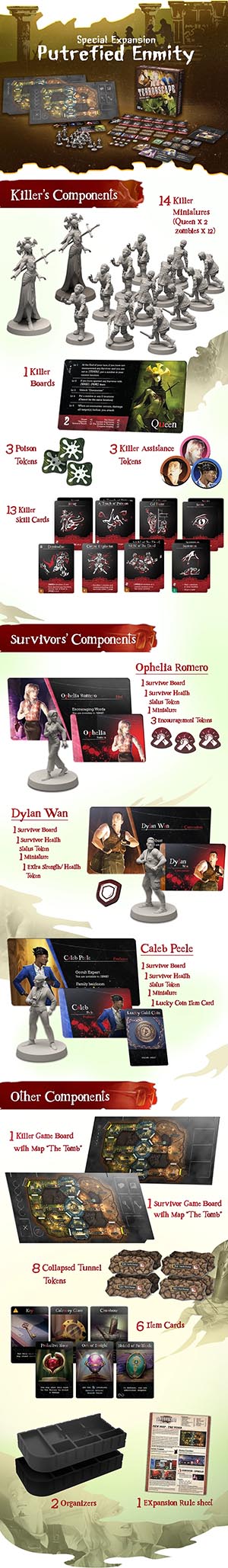 Una tumba excavada en lo profundo de la montaa, construida hace siglos para sellar a la Reina. Fue descubierta recientemente por un grupo de arquelogos, quienes llevaron a cabo estudios de campo. Sin embargo, nadie se dio cuenta de que haban despertado aquello que nunca debi ser perturbado. Un equipo de hasta 3 supervivientes luchar contra 1 Reina Inmortal. Si eres fan de pelculas como "La Momia", o el gnero Zombie, sin duda esta es tu expansin. Todo el contenido mostrado en ingls ser ntegramente traducido al espaol.