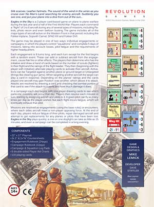 Eagles in the Sky Silk scarves. Leather helmets. The sound of the wind in the wires as you cruise over No Mans Land searching for enemy aircraft. Suddenly you see one, and put your plane into a dive from out of the sun... Eagles in the Sky is a 2-player card-based game on plane to plane warfare during the last year and a half of the First World War. Players each command a "flight" of 1 to 6 aircraft during any of several types of missions, including Patrols, photo recon and even balloon busting. The game includes all of the major types of aircraft active on the Western Front in that period, including the Fokker triplane, Sopwith Camel, SPAD XIII and Fokker DVII. Eagles in the Sky may be played in one of two ways: individual engagements or campaigns, in which the players control "squadrons" and complete 5 days of missions, taking into account losses, pilot fatigue and the requirements of higher headquarters. Each engagement is 8 turns long, and each turn except for the first begins with a random event. These can add or subtract aircraft from the engagement , cause flak fire or other effects. The players then determine who has the initiative and draw a hand of cards based on the number of scouts (fighters) in their flight and the ratings of the flight leader. They then (beginning with the player with initiative) alternate playing cards to activate their aircraft. Activations can be Targeted against another plane or ground target or Untargeted (things like clearing gun jams). When targeting another aircraft the target can play a card in response. Depending on the planes ratings and the cards played one aircraft may gain Position over another, which allows it to attack. Attacks are resolved by drawing a card and checking the combat portion of that card to see if the attack succeeds and how much damage it does. In a campaign each day begins with one player drawing cards to see which particular missions will occur that day. Players then resolve each mission in turn, starting by assigning aircraft and pilots to it. A given pilot can fly as many times per day as the player wishes, but each flight incurs fatigue, which will eventually exhaust that pilot. Missions are resolved as engagements (using the base rules) or encounters, where each sides aircraft meet a non-player opposing force. At the end of each day, players reduce fatigue of their pilots, repair damaged aircraft and attempt to get replacements for any planes or pilots that have been lost. The game plays quickly; a one on one dogfight can take as little as 15 minutes, and even a campaign can be completed in a long evening. Components include a play mat, 140 1" square aircraft counters, 140 1/2" square markers, 110 cards and numerous play aids and record sheets. Components: 110 Maneuver cards 1 401 Aircraft counters 1 765/8 Markers 1 Campaign Log pad (50 sheets) 1 Squadron Log pad (50 sheets) 5 Player Aid Cards 1 22x17 Play Mat - Mounted Board 1 Engagement Game Rulebook 1 Campaign Game Rulebook 1 Allied Aircraft Marker Display card 1 German Aircraft Marker Display