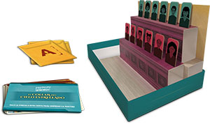 19 cartas de Juicio y 5 sobres de Pruebas (con 36 cartas de Prueba en total), 12 fichas de Jurado, 1 Tribuna del jurado, 1 reglamento