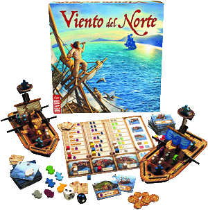 Diseado por Klaus Teuber (Catan), Viento del Norte es un juego de aventuras familiar en el que los jugadores toman el papel de capitanes mercantes que tratan de comerciar entre las ciudades costeras a la vez que evitan encontrarse con los piratas, hasta que consiguen equipar a sus barcos con los caones y los medios para combatirlos.