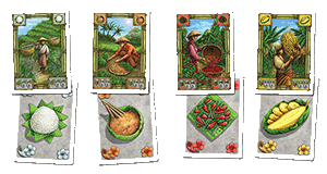 En tu turno, primero tendrs la opcin de coger cartas de bienes entre los disponibles: pimienta, arroz, bananas o cacahuetes. El coste es alto: 5 piedras menos la cantidad de agricultores de ese tipo de bien. Cuantos ms agricultores del mismo tipo acumules, ms bienes de ese tipo podrs conseguir durante la partida.