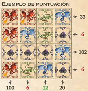 Dragon Master Edicin en Espaol y Portugus En Dragon Master tu objetivo es crear lneas verticales para conseguir puntos de victoria. Como os sentis en esquinas contiguas (en lugar de opuestas) en la mesa, tus lneas horizontales se ven como lneas verticales para tu oponente, y viceversa. Esto es algo bsico en el juego. Cada jugador cuenta de forma individual sus 4 lneas verticales. Si una carta est presente solo una vez en la lnea, el jugador gana esa cantidad de puntos. De esta forma las cartas proporcionan de 0 a 3 puntos. Si una carta est presente dos veces en la lnea, esas dos cartas juntas proporcionan diez veces su valor y si una carta est presente tres veces en la lnea, esas tres cartas juntas proporcionan 100 puntos. Para puntuar, se tiene en cuenta nicamente los puntos de t lnea de puntos menos valiosa: trata de puntuar lo mximo posible en tus lneas !pero cuidado al colocar tus cartas, puede que tu rival se aproveche de ello! El jugador con ms puntos ser el ganador. Haz clic aqu para descargar el Reglamento en Espaol (Requiere iniciar sesión)