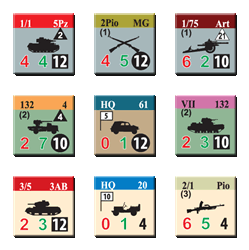 Each game turn represents approximately six hours. Game turns are not divided into separate friendly and enemy turns, but rather they are comprised of numerous individual headquarters activations. The map represents the western half of the Tobruk fortifications in 1941. Each hexagon encompasses about 500 meters.