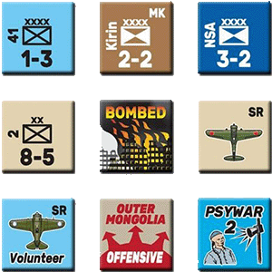 Each hex on the map represents 75 kilometers across. Each turn of play represents one year of operations. Japanese ground units are divisions and brigades. Allied Japanese, as well as most Chinese units, are at the army and corps level, representing shifting arrays of forces. Air units represent various numbers of sorties needed to accomplish missions.