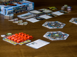 UN JUEGO DE BUCEO Y URBANISMO SOBRE FLOTILLAS Dos rivales compiten sobre los restos flotantes del viejo mundo: las flotillas. Pero, en un mundo con recursos limitados, incluso los rivales tienen que jugar limpio. En Seastead, tienes que construir la base para el progreso de la civilizacin, pero no puedes hacerlo solo. Podrs cerrar un trato con tu rival mientras sigues llevando la delantera? Bucea en el mar para hallar nuevos materiales, pero solo podrs quedarte con la mitad! Divide el botn con tu rival, intenta quedarte con lo mejor y construye astilleros, academias y puertos para mejorar el nivel de vida de tu sociedad. Disfruta de una aventura profunda y estratgica en tan solo un rato! Componentes: ⦁ 2 tableros de jugador ⦁ 24 Edificios ⦁ 8 Barcos ⦁ 20 cartas de Buceo ⦁ 16 cartas de Especialista ⦁ 16 cartas de Decreto ⦁ 2 ayudas de jugador ⦁ 4 losetas de Flotilla ⦁ 12 losetas de Muelle ⦁ 40 fichas de recurso ⦁ 4 fichas de Demanda ⦁ 20 fichas de Limpieza ⦁ 1 bloc de puntuacin ⦁ 1 reglamento
