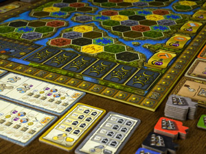 Terra Mystica: Comerciantes de los Mares El comercio est floreciendo en TERRA MYSTICA a medida que los Barcos navegan los ros y los Comerciantes transportan sus mercancas por tierra. Crea un nuevo mundo de comercio y competencia con nuevas habilidades de faccin, 2 nuevos mapas y nuevas losetas de bonificacin y puntuacin. La expansin COMERCIANTES DE LOS MARES es totalmente compatible con la expansin FUEGO Y HIELO, pero no se requiere FUEGO Y HIELO para jugar a esta expansin. Componentes 1 tablero central 4 losetas de bonificacin 10 tableros de Astillero (doble cara) 12 losetas de puntuacin 12 losetas de Favor 105 marcadores de Comercio 9 Astilleros de madera 33 Barcos y Comerciantes de madera y ms!