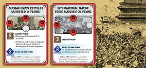 Keep Up The Fire! The Boxer Rebellion Keep Up The Fire! is a solitaire game set in 1900 Peking, China. You are in command of the Foreign Legations (Ambassadors, their families, staff and small security forces) in the areas assigned to imperial powers and a relief column coming to their rescue. An anti-imperialist revolution is sweeping China and your presence has become the focal point of the Chinese Boxers (Society of the Harmonious Fists) and Imperial Manchu forces of the Qing Army who are angry and determined to expel all foreigners from China. Outnumbered, outgunned, and besieged within a small compound in the heart of Peking, you must hold on and hope the relief column can get to you in time. At the Legation Compound siege, you must coordinate the various foreign detachments that have joined to defend their position until an eight-nation relief column arrives. You also command the eight-nation relief column, battling their way from the port of Taku, inland through hostile territory, trying to break the siege at Peking. The game is a race against time as the Chinese forces besieging the Legation Compound are attacking relentlessly while the relief column battles its way to the rescue. With limited time and relentless attacks on the Compound, will you manage to Keep Up The Fire? Note that this game can also be enjoyed in teams working together (just as the Eight Nations had to), deciding how best to defend the Legation Compound and get the relief force to Peking in time! Components: Rule book Large hard mounted tactical game board of the Legation Smaller hard mounted strategic map for relief column Deck of Action/Event cards Counter sheet Battle Archive 1 die Tray for components Sleeve for box with alternate cover