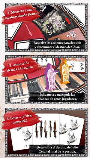 23 Knives (23 Puales) Edicin ntegra en Espaol Esta es la edicin de Kickstarter. Incluye todos los Stretch Goals desbloqueados durante la campaa Cartas de Ciudadano de Spurrina y Cleopatra 6 cartas adicionales de ciudadano 8 cartas adicionales de intrigas Daga de madera serigrafiada Monedas de votacin en madera serigrafiada Meeples de ciudadanos serigrafiados Curia y escaleras en formato 3D Es el ao 44 a.C., el apogeo de la Repblica Romana. Al final de la guerra civil, Julio Csar ostenta un enorme poder. Cuenta con el amor de muchos, pero para otros slo existe el miedo. Este miedo lleva a los amigos y aliados de Csar a cuestionar sus intenciones. Estn avivando el fuego de la conspiracin, una conspiracin que terminar en los Idus de Marzo, con 23 pualadas, una repblica en ruinas y el nacimiento de un Imperio. En una partida de 23 Puales, asumes el papel de un ciudadano romano con una de tres lealtades: un leal al Csar, un libertador de Roma o un oportunista que espera su momento. A lo largo del juego, viajas por Roma, manipulando a otros ciudadanos y hacindoles inclinarse por tu causa. Al final de la partida, si hay 23 o ms dagas en la Curia, Csar est muerto y gana el libertador ms comprometido con matar a Csar. Con menos de 23 dagas, gana el leal ms dedicado a salvar a Csar. Los oportunistas son los que se quedan esperando para cambiar el destino de Csar en el ltimo momento, y si lo consiguen, ganan como equipo. 23 Puales es un juego de manipulacin social. La identidad inicial de tu Ciudadano est oculta, al igual que su Lealtad, pero esto seguramente cambiar. Tu tarea consiste en planificar con antelacin y mantenerte flexible, decidiendo a qu bando manipular y contra cul elaborar estrategias, todo ello mientras maniobras entre las mareas de Roma y el propio destino. Contenido (sujeto a cambios): 1 tablero de juego 1 tablero de votacin 1 curia en 3D 1 escaleras a la curia en 3D 1 daga de madera serigrafiada 8 ciudadanos de madera serigrafiados 8 fichas de votacin a doble cara 8 cartas de referencia 86 cartas de destino 68 cartas de influencia 25 cartas de intrigas 25 cartas de ciudadano