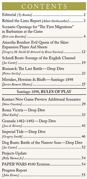 Paper Wars 102 Santiago Campaign, 1898 by Javier Romero. This is a two-player (solitaire adaptable) simulation of the land campaign for Santiago de Cuba, which ended with the surrender of the Spanish forces after the hard-fought battles of San Juan Hill and El Caney.