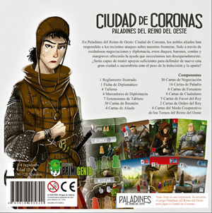 Paladines del Reino del Oeste: Ciudad de Coronas En Paladines del Reino de Oeste: Ciudad de Coronas, los nobles aliados han respondido a los recientes ataques sobre nuestras fronteras. Solo a travs de delicadas negociaciones y diplomacia, estos duques, barones, condes y margraves ofrecern la ayuda que necesitamos tan desesperadamente. Sers capaz de reunir apoyos suficientes para defender de nuevo esta gran ciudad o sucumbirs ante el peso de la indecisin y la apata? En esta expansin para Paladines del Reino de Oeste se aaden nuevas extensiones de tablero, un nuevo atributo que gestionar, nuevas cartas y nuevo modo solitario ms complejo. Contenido 1 reglamento ilustrado 1 ficha de diplomtico 4 talleres 4 marcadores de diplomacia 7 extensiones de tablero 30 cartas de reunin 4 cartas de aliado, 30 cartas de negociacin 16 cartas de paladn 6 cartas de forastero 8 cartas de ciudadano 5 cartas de favor del rey 2 cartas de orden del rey 6 cartas del modo cooperativo de los Tomos del Reino del Oeste.
